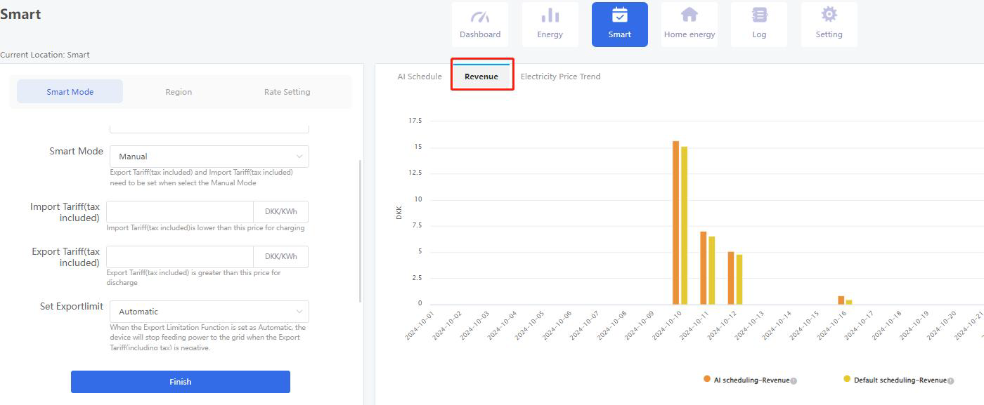 Revenue – prezentuje szacowany przychód wygenerowany dzięki funkcji Negative Tariff Mode w ujęciu dziennym lub miesięcznym.